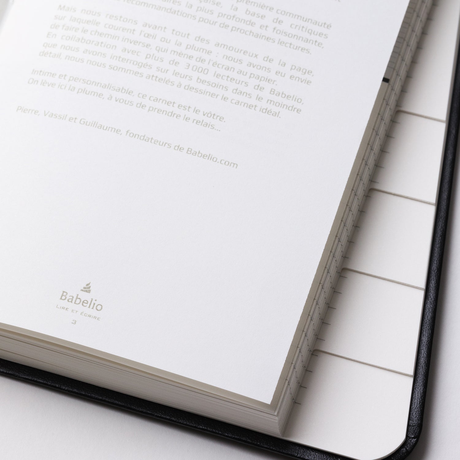 Mais nous restons avant tout des amoureux de la page, sur laquelle courent l’œil ou la plume : nous avons eu envie de faire le chemin inverse, qui mène de l’écran au papier. En collaboration avec plus de 3 000 lecteurs de Babelio, que nous avons interrogés sur leurs besoins dans le moindre détail, nous nous sommes attelés à dessiner le carnet idéal.